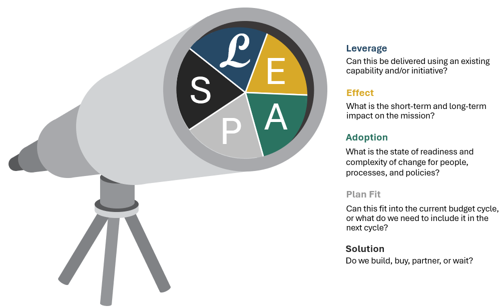 A traditional approach to prioritization (e.g, the Gartner AI Lens) uses a 2 X2 matrix of value & feasibility. However, this approach ignores long budget horizons, legislative approvals, union dynamics, and the build-versus-buy dilemmas often faced by government executives. We have developed a framework called LEAPS that addresses these blind spots while remaining easy to apply. The updated framework uses clear, actionable labels and questions: